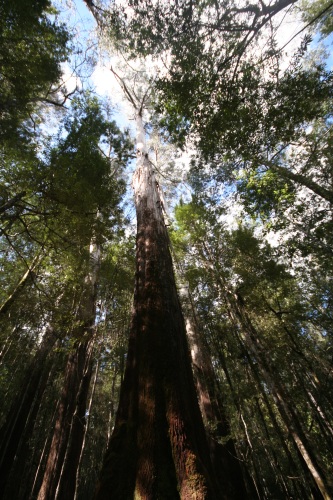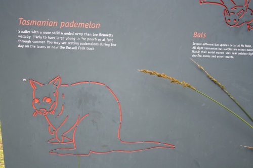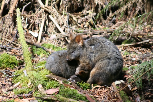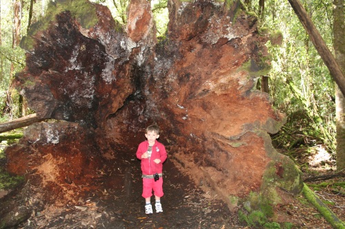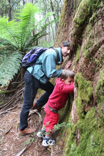 Bien dormi, tellement bien qu'il est 9h plein jour et toute la maisonnée est toujours endormie. On remballe le tout, Celian va au terrain de jeux du camping. Le camping est au bord de l'eau. Bien sympathique, direction Mount Field National Park,. Il pleut un petit peu, averses éparses. 80 km plus loin nous arrivons au national park, on discute avec le ranger qui est fan de photographie. D'après lui l'Hasselblad XPAN n'est plus fabriqué, quel dommage. C'est un très bon appareil. Nous nous élançons sur le premier chemin en direction des chutes. Après 10 min de marche dans une forêt de fougères arborescentes et d'arbres gigantesques (70m à 100m). On arrive à une superbe cascade de quelques centaines de mètres. Célian est très gentil, il marche bien. On cherche les champignons et tout un tas de trucs pour motiver les troupes. La forêt est extrêmement jolie, toute pleine de mousse, les troncs sont tout vert, c'est cotonneux. Un petit paradis où il vaut mieux ne pas se perdre. On rencontre sur le chemin un petit kangourou, son vrai nom est un pademelon. Bref très bonne balade, on rallonge même par une boucle supérieure avec le chemin des grands arbres. 6h, il est temps de rejoindre le camping, dans la forêt et de faire la douche, l'apéro, le dîner et bientôt fermer les petits yeux. Pendant le dîner 4 petits pademelons viennent jusqu'à nos pieds. Certains ont même des bébés dans leur poche. Une petite tête qui sort sur le coté. Pendant la pose pipi de la nuit c'est toujours comme ça en camping, Magali a été effrayée dans les toilettes par un bandicoot qui courrait sur la poutre du toit. 5 min plus tard quand je suis allé vérifier, ce charmant petit animal (un gros chat en taille) dormait sur sa poutre. Il est probable que ça soit plutôt un opossum d'après ce qu'on verra plus loin. |