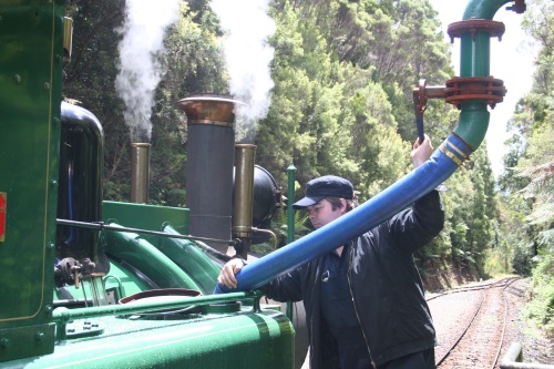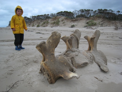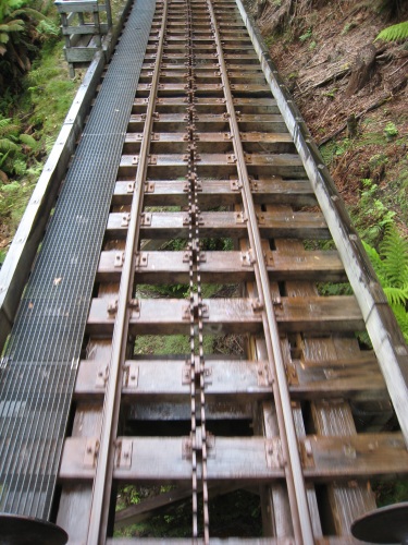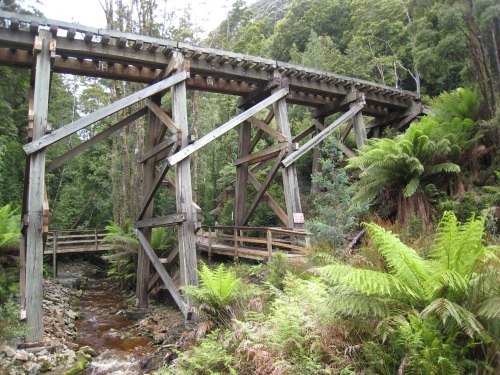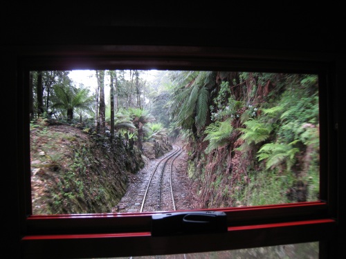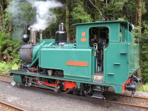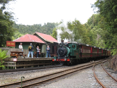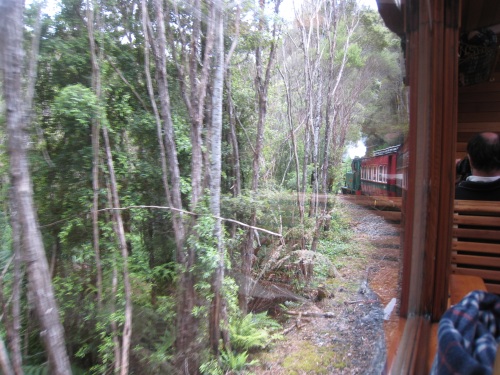 | Il a plu durant la nuit Étonnant non ? Ce matin, levés aux aurores car on veut prendre le train. 7h30, un peu avant le réveil, tout le monde ouvre les yeux. Petit déjeuner dehors avec un petit rayon de soleil, ça fait du bien. Comme on dit : l'avenir est à ceux qui se lèvent tôt. On est donc en ville à l'heure pour prendre le train à vapeur. 32 km, 300$ c'est peut-être le plus cher au km, mais ça vaut le coup. La première moitié du chemin se fait avec une locomotive diesel (mais quand même de look ancien). Les wagons sont à l'ancienne eux aussi. C'est marrant ça plait bien à Célian. On passe à travers la forêt vierge (rain forest, ça porte bien son nom car devinez quoi, le soleil n'a pas fait de vieux os et maintenant il pleut encore). On est dans le monde de Percy et Thomas. A mi-chemin on change de wagon et on prend maintenant la locomotive à vapeur. Ils la tournent dans le bon sens sur la table à rotation. Le chemin de fer passe sur des ponts de bois, le long de la rivière, avec des à-pics impressionnants. Après les 3h de trains (pour faire 32km) et 1h de pause pour déjeuner, nous arrivons a Queenstown. Il faut dire que ce chemin est le plus escarpé de l'hémisphère sud. Un système de créneaux et crantages sur un 3eme rail est utilisé (système allemand - Apt). On retourne à Strahan par bus. La balade nous a pris une journée. 2-3 courses, on repasse par le camping pour réserver notre place, puis on va faire un tour à l'estuaire de " Hell's gate ". On découvre sur la plage des restes de baleine, 3 grosses vertèbres et un rostre. On essaye de faire du cerf volant, ce n'est pas le vent qui manque, mais plutôt la pluie qui nous fait rebrousser chemin. BBQ au camping, lessive, douche, et rituel du soir Bonsoir les amis, à demain si vous le voulez bien. | |