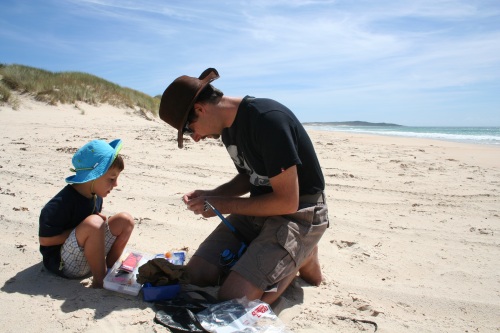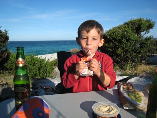 Célian s'est couché avec une idée en tête, faire une partie de flipper, donc la première chose qu'il a en tête en se levant a été de demander à faire une partie de flipper. Bon on arrive quand même à faire le petit déjeuner d'abord puis pendant qu'on rangeait, Monsieur s'est éclaté sur le coussin gonflable. Et avant de partir du camping on fait cette partie de flipper. Puis on été à la plage. Les dunes de Péron sont belles, j'essaye de pêcher un peu, mais sans succès. Célian fait des glissades sur les dunes avec une pancarte, sans grand succès non plus. Le lieu est vraiment beau. Puis on reprend le camping-car et on va se faire un sandwich et du maïs au pied d'un terrain de jeux devant la mer. On voit plein de méduses, et petits crabes. Les méduses sont étonnantes, elles font plus de 40cm de diamètre. On finit par reprendre le camion pour aller à " Bay of fire " où on trouve un super coin pour pauser les affaires, on est SUR la plage Le bruit des vagues va nous bercer ce soir. On joue sur la plage, on pêche, on fait de la lecture avec Célian et il est l'heure de l'apéro. La belle vie quoi. Après l'apéro, jeux dans le camion et super repas de pâtes à la tomate oignons champignons et ketchup pour Célian. Puis avant le dodo, 30 min de pêche, mais toujours rien . Mieux vaut dormir. A demain, les pieds dans le sable. |